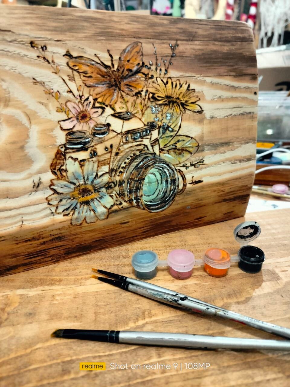 Su un castagno di 60 anni, ho inciso con il pirografo una macchina fotografica, che poi ho colorato con acrilici vivaci. Personalmente, non amo l'incisione a solo pirografo, e l'aggiunta del colore ha trasformato quest'opera in qualcosa di unico, che racconta la mia visione artistica e la voglia di andare oltre i confini tradizionali. Un pezzo che porta con sé il peso del tempo e la leggerezza della creatività.